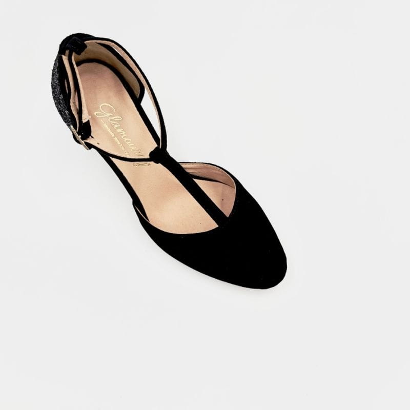 Footwear made of natural leather - black suede, black coarse brocade, beige sole and lasts.