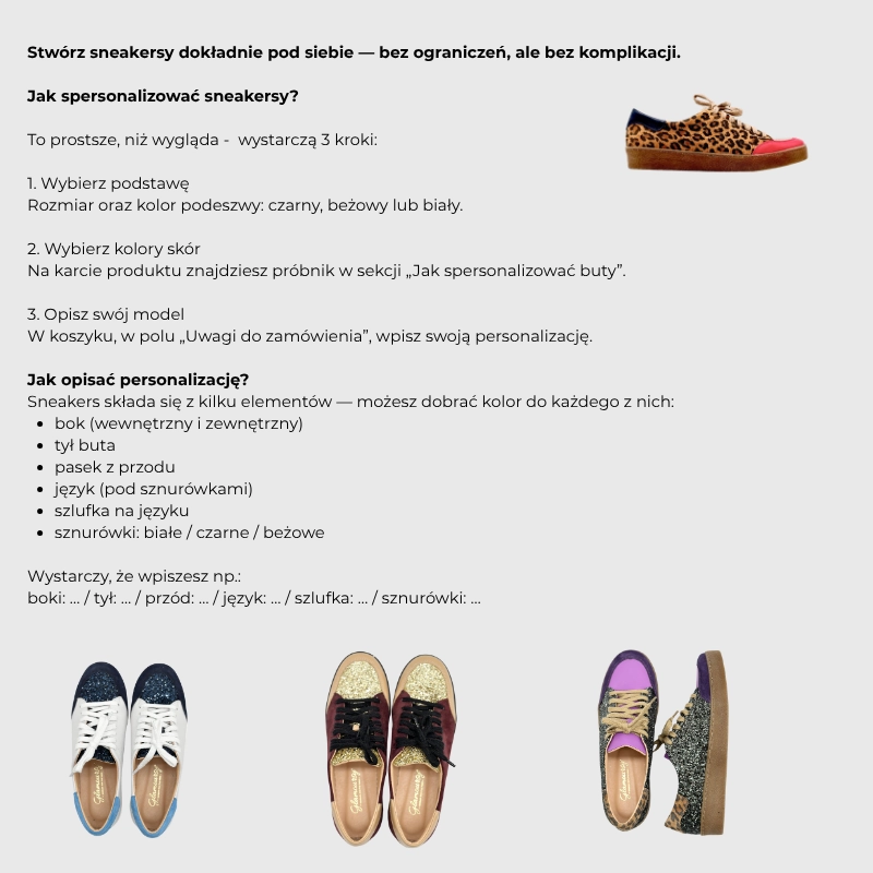 Ten model możesz zamówić w wersji spersonalizowanej – wybierz rodzaj skóry oraz kolor, tworząc buty dokładnie takie, o jakich marzysz. Produkt personalizowany od standardowego różni się tym, że powstaje specjalnie dla Ciebie, dlatego jest w 100% unikatowy i nie podlega zwrotowi.