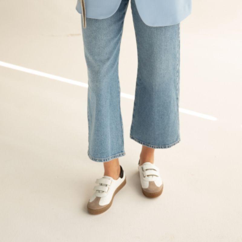 Footwear made of white pea-patterned natural leather, cappuccino velour front, black grain heel.