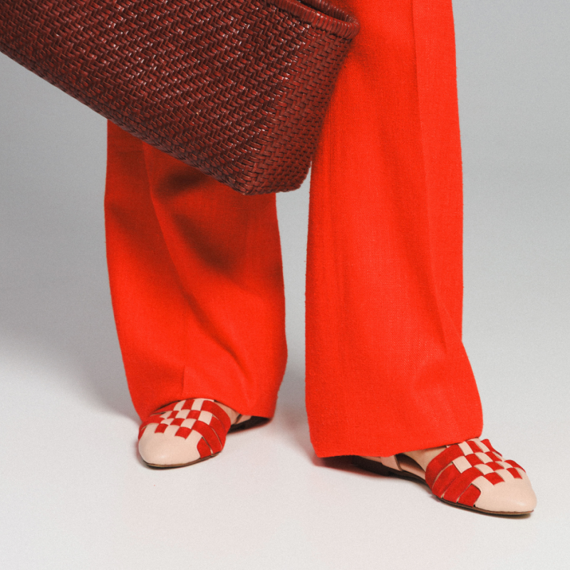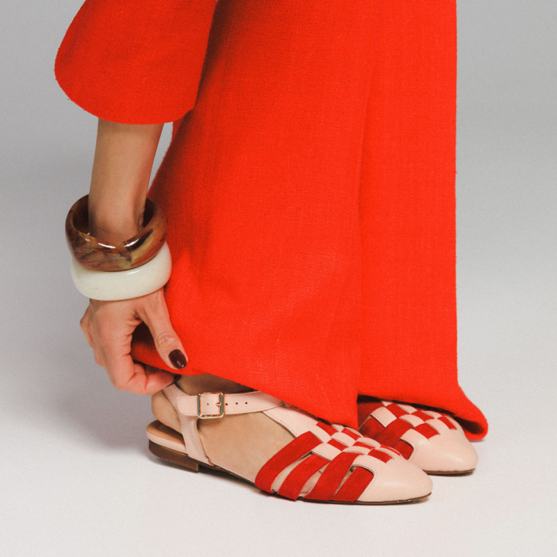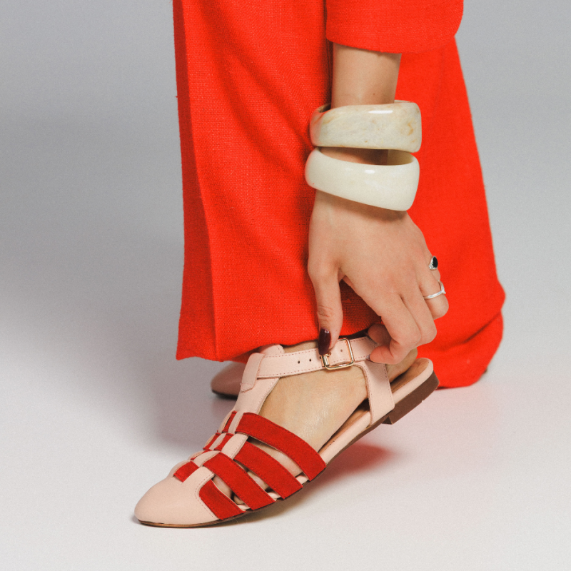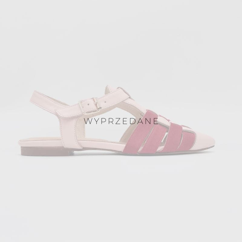 - skóra lico w kolorze jasnego różu i skóra zamszowa w kolorze czerwonym, zapięcie złote, beżowa podeszwa