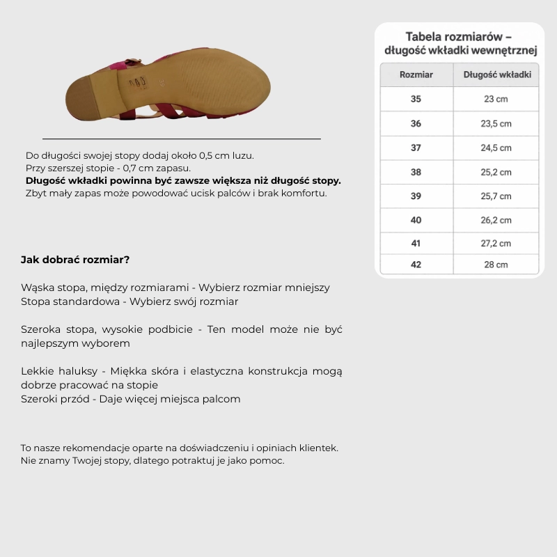 Aby idealnie dopasować rozmiar butów, należy do zmierzonego wymiaru stopy dodać 0,5 cm - to długość wkładki.