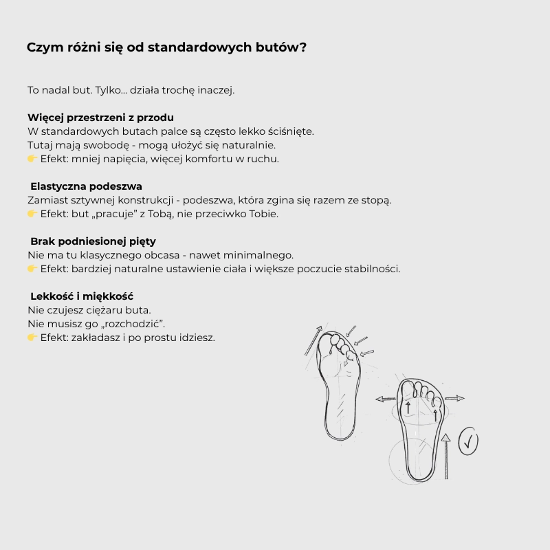 Sneakersy damskie barefoot to odpowiedź na potrzebę ruchu, wygody i naturalności w codziennym noszeniu. To kolejny but barefoot w kolekcji Glamoursy. Miękka, elastyczna podeszwa daje uczucie lekkości i swobody, a skórzana cholewka pięknie współpracuje z każdym krokiem. Idealny dla tych, którzy cenią sobie naturalny ruch stopy i komfort przez cały dzień.