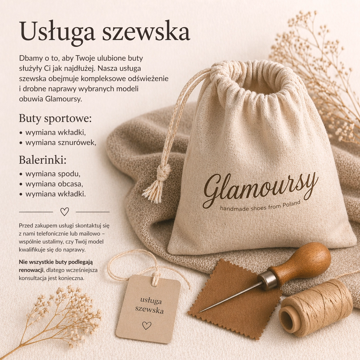 Dbamy o to, aby Twoje ulubione buty służyły Ci jak najdłużej. Nasza usługa szewska obejmuje kompleksowe odświeżenie i drobne naprawy wybranych modeli obuwia Glamoursy.