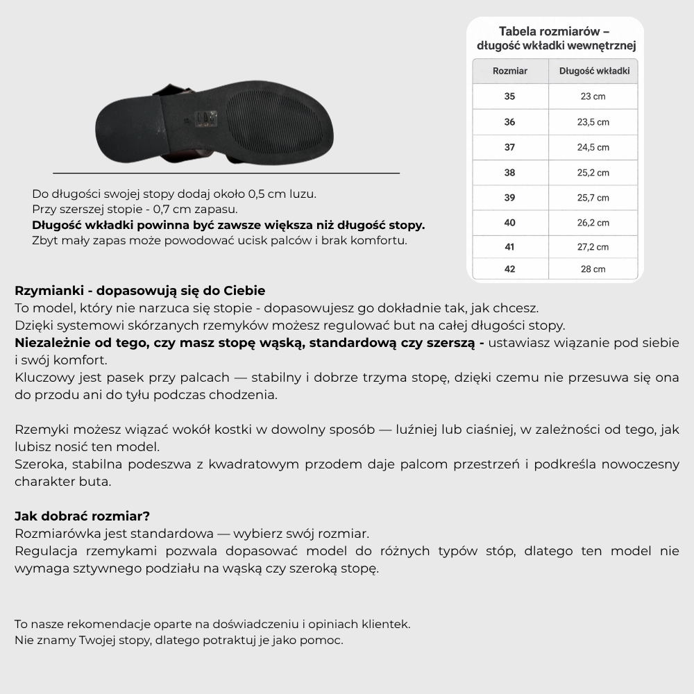 Model Favorite to odpowiedź na potrzebę codziennego komfortu i radości z noszenia. To but, który dopasowuje się do Ciebie – nie odwrotnie. Miękka skóra naturalna, która dopasowuje się do Ciebie i daje uczucie lekkości i swobody. Sandały wiązane to idealny wybór dla tych, którzy cenią komfort przez cały dzień.