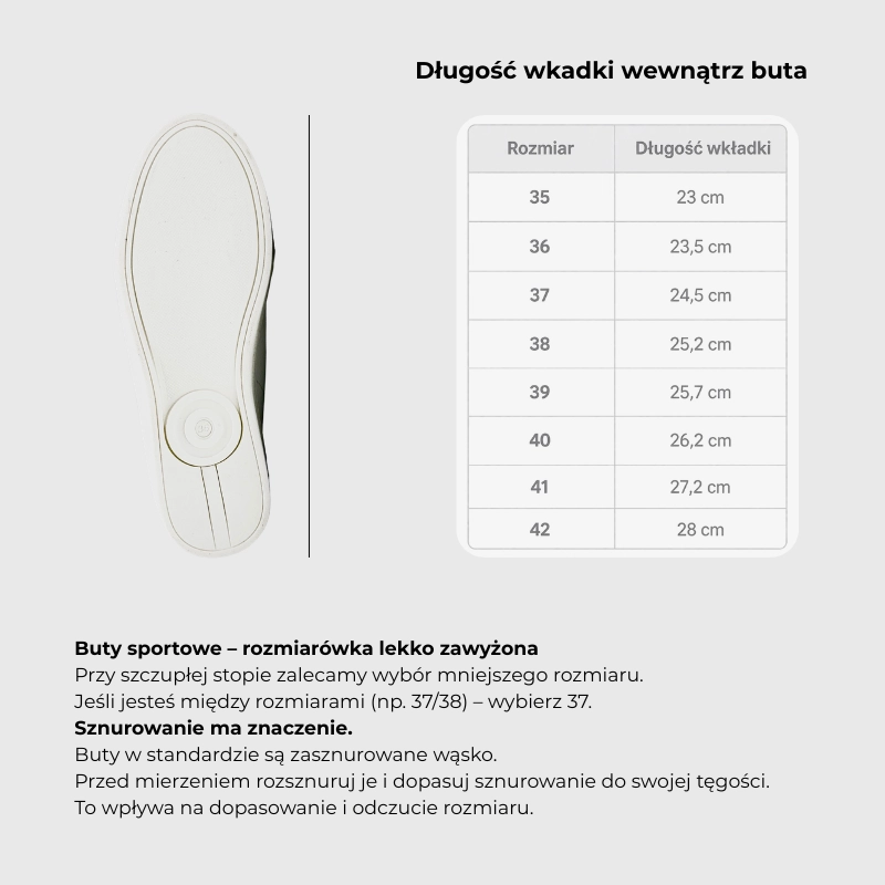 Przy szczupłych stopach z niskim podbiciem wybierz mniejszy rozmiar. Pamiętaj także, że zwykła skórzana wkładka świetnie reguluje problem z tęgością.